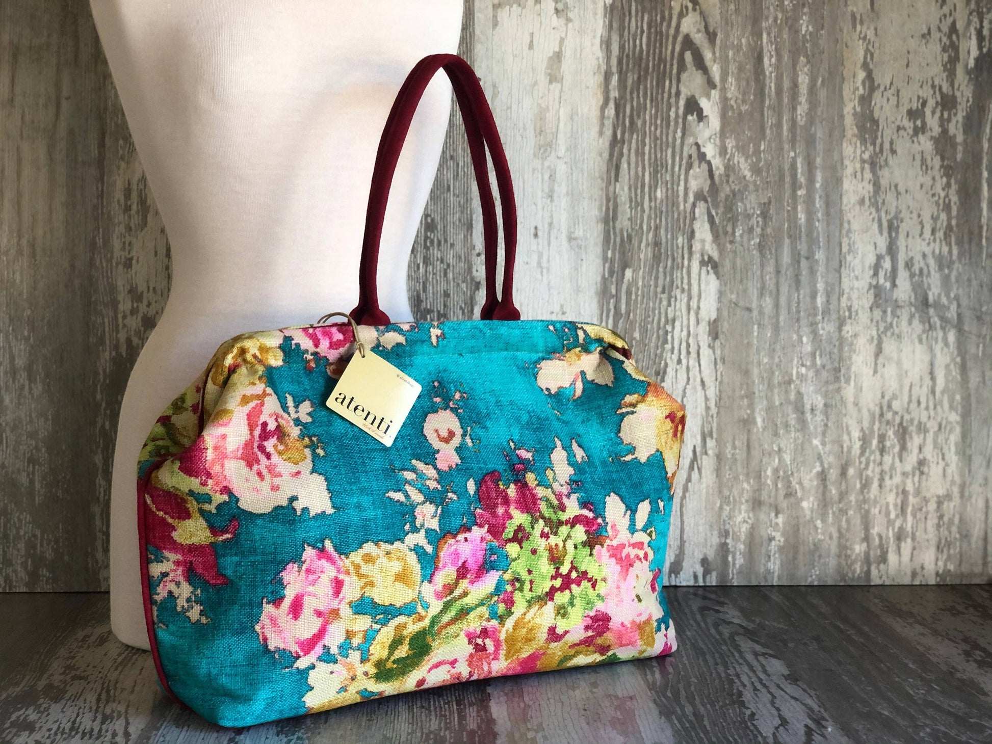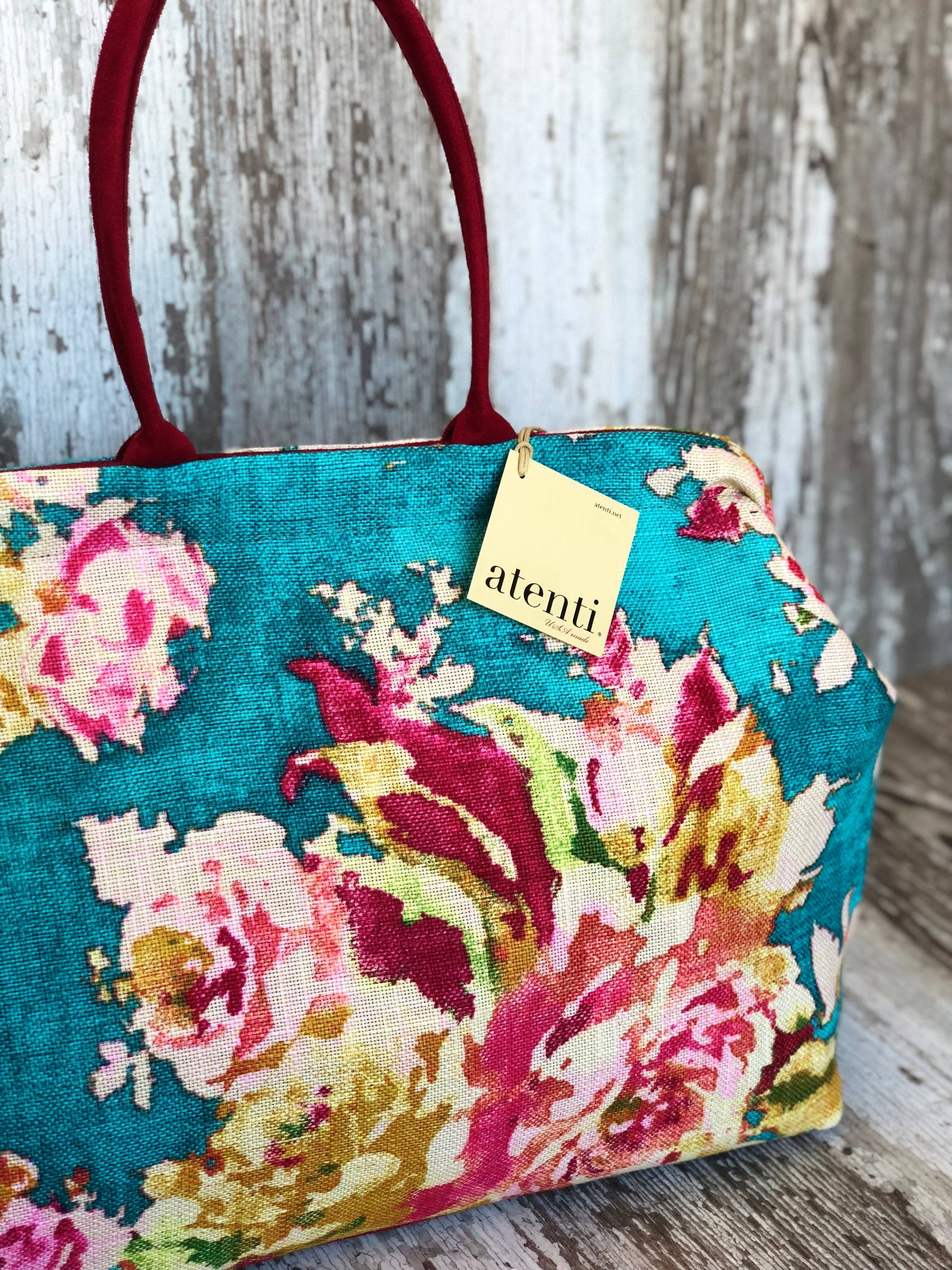 A robust texture cotton linen blend printed with a bold floral watercolor design. Opening with a 16" rectangular snap frame, the Atenti Pioneer carpet bag shows off a fully lined water resistant taffeta interior. Inside are a zippered pocket and an open divided pocket with a cell phone slot. The Pioneer has double 21” straps with a 10’ drop and metal feet. Dimension: 21.00"W x 12.00"H x 5.00"D