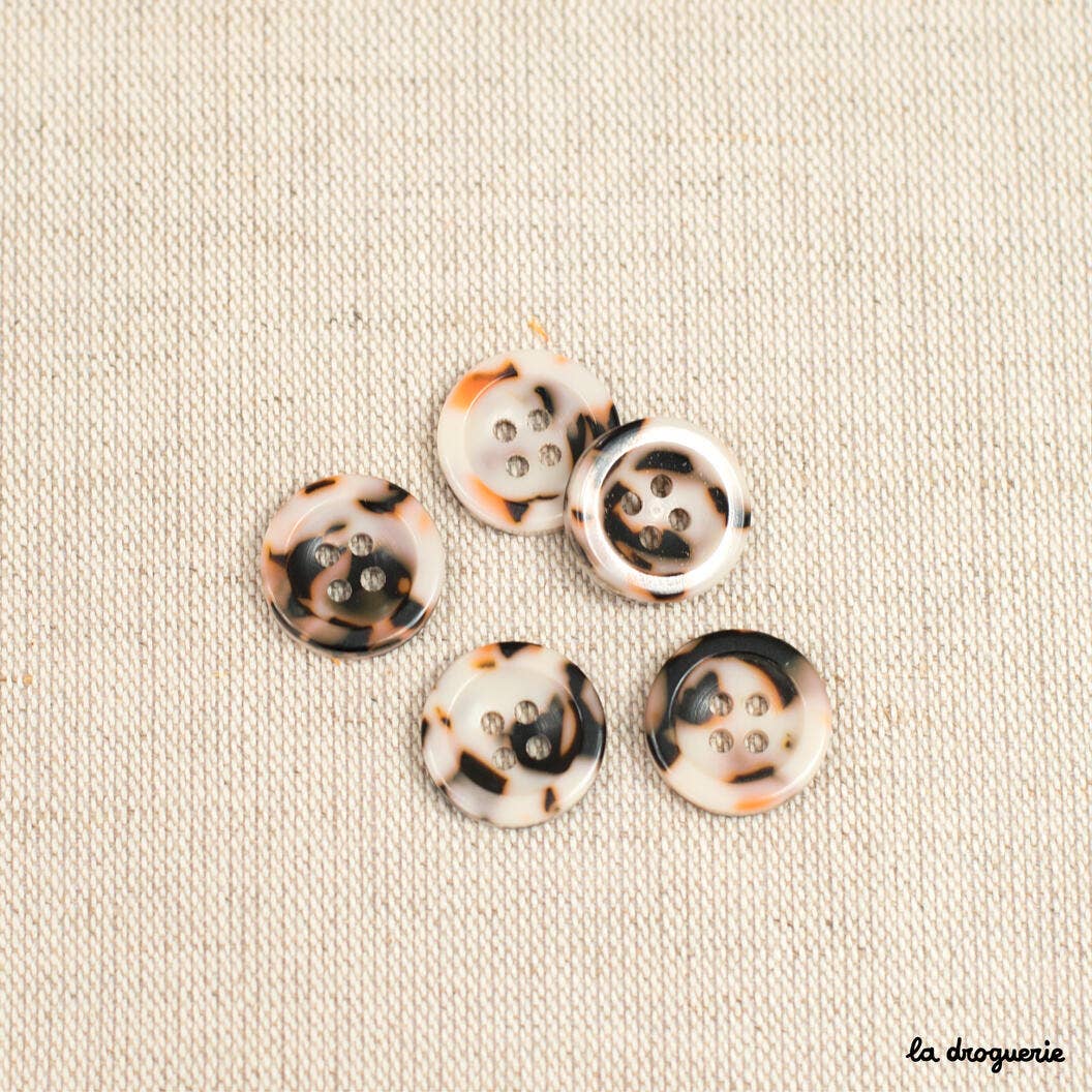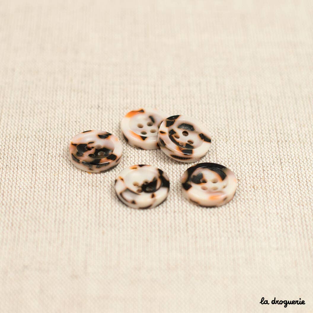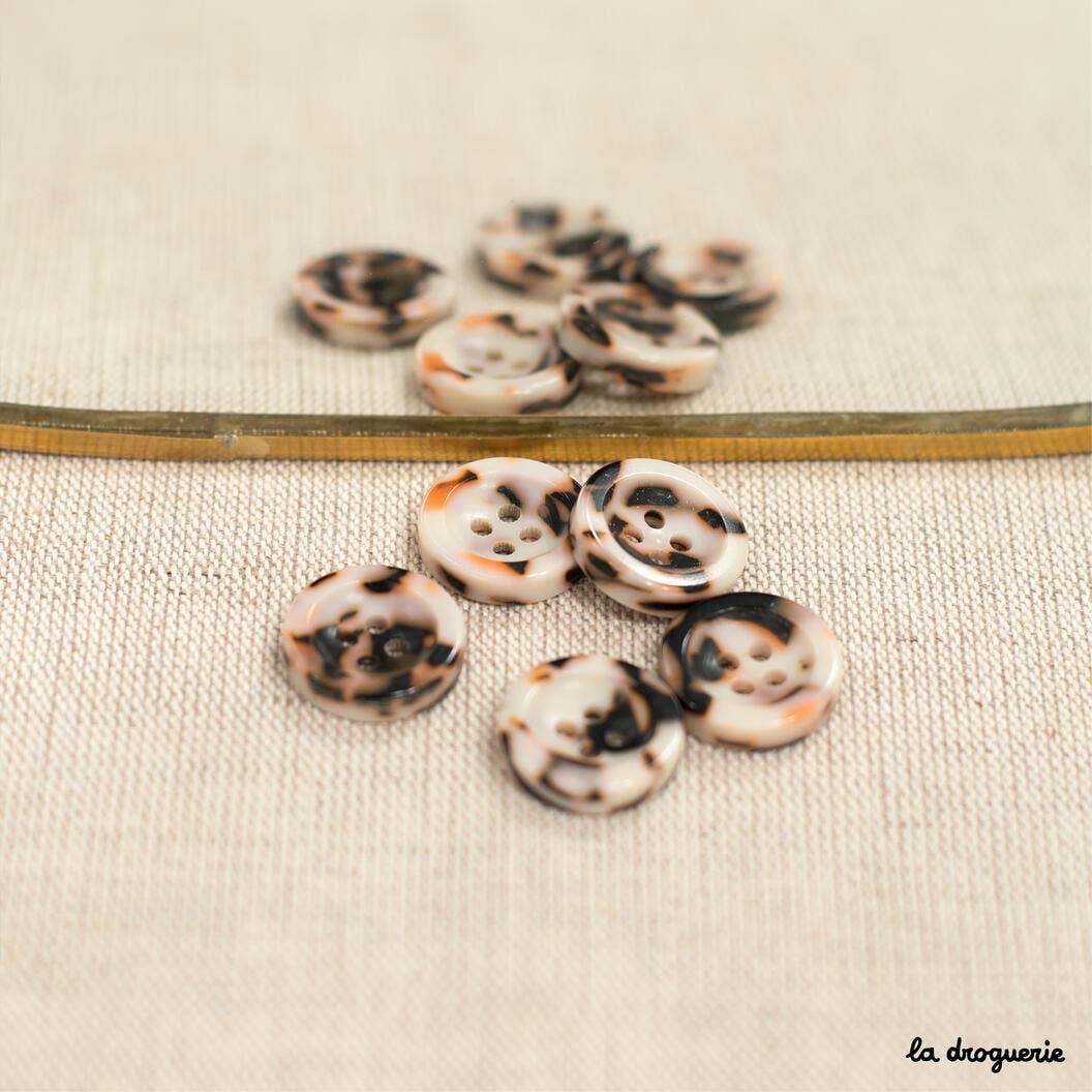 Round four-hole button, with a raised edge. Made in France, in rhodoid. Its cheetah appearance delights us, it can be sewn anywhere, on our blouses, jackets, or cardigans. It is thick and available in a lovely speckled Bordeaux color, for a Grrraou effect.