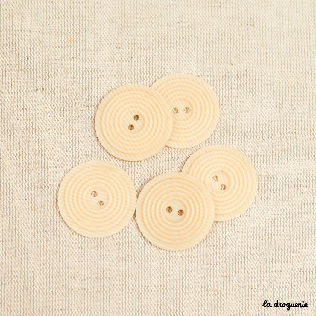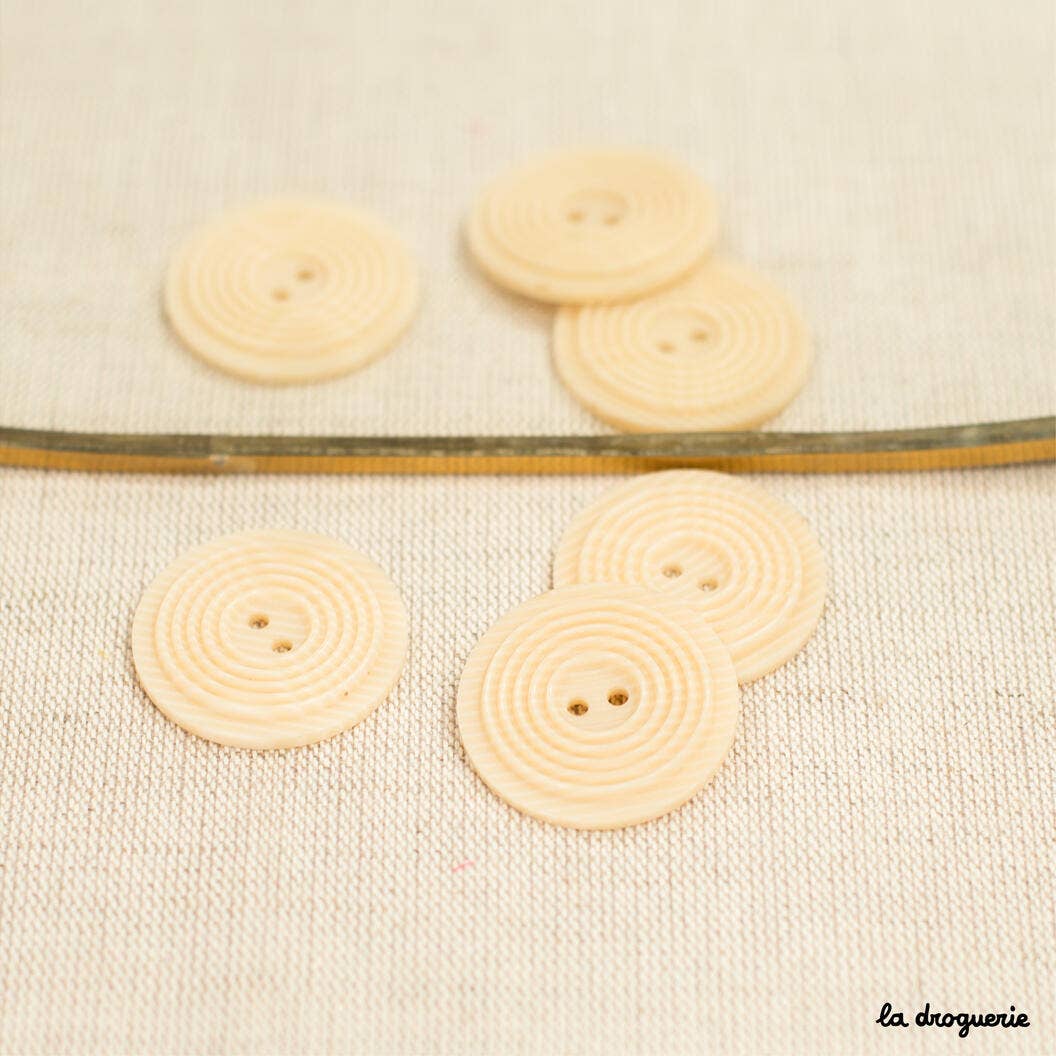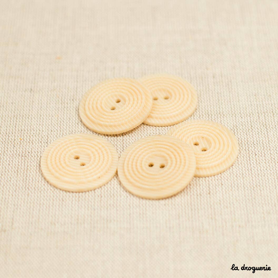The 31 mm Sand Grain button is made of rhodoid, a lightweight and durable material. It features a round shape with a circled relief and has 2 holes for stable attachment. This button is made in France and with its large size, it is perfectly suited for sewing creations such as coats, jackets, or bags.
