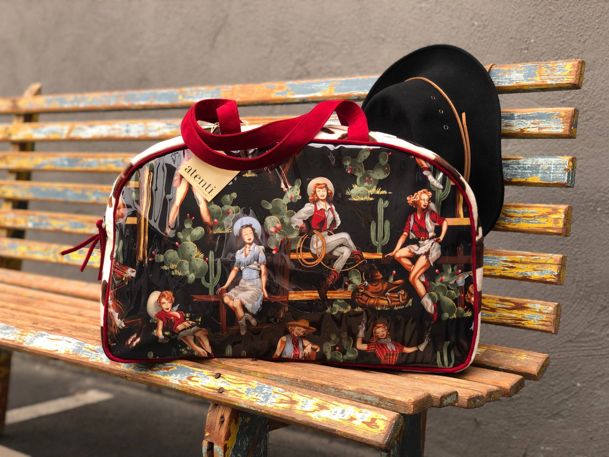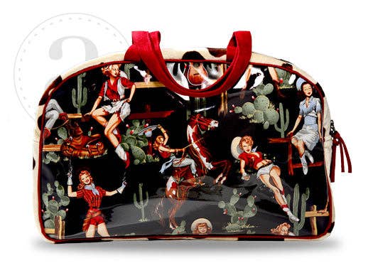 A vintage Western style cotton print encased in clear PVC with a short pile pony gusset. Perfect for a weekend away, a knitter's project bag, an airline carry-on or a diaper bag, our roomy Overnighters have double straps, a 28" zippered opening and a full water resistant lining. Inside are a zippered pocket and a divided pocket with a cell phone slot.