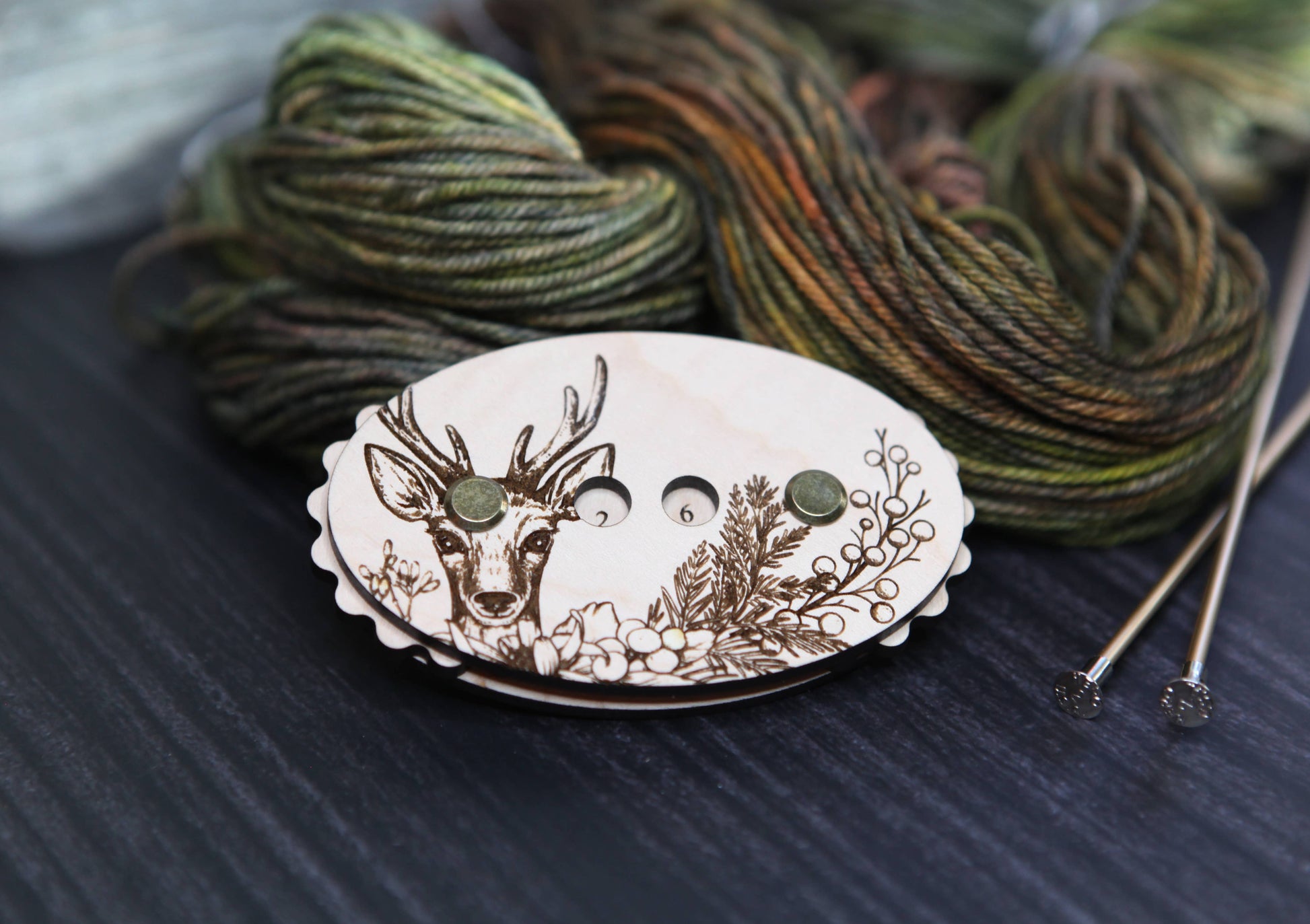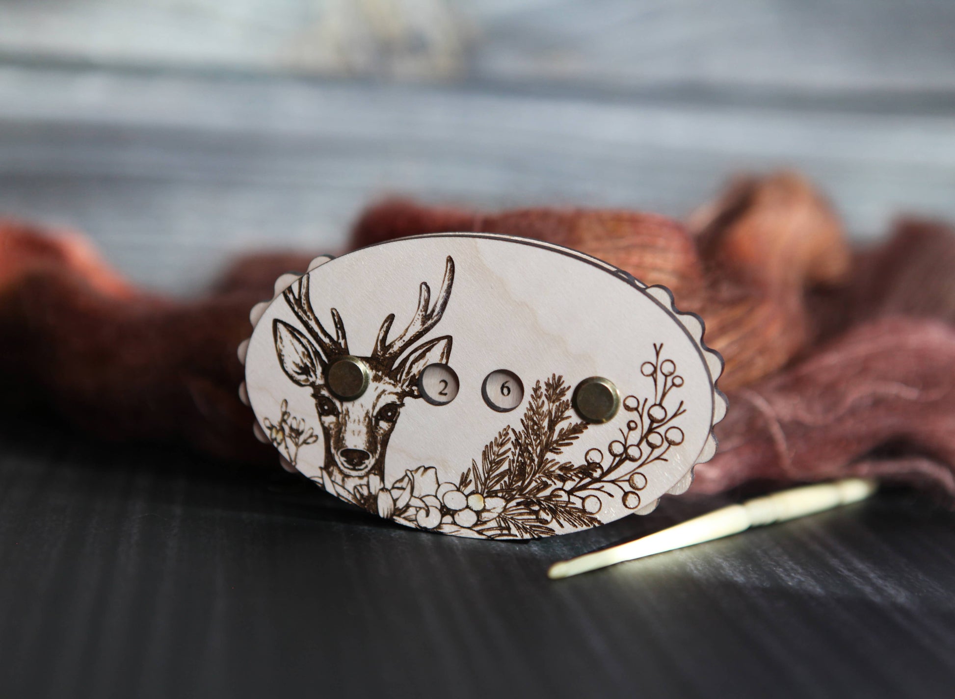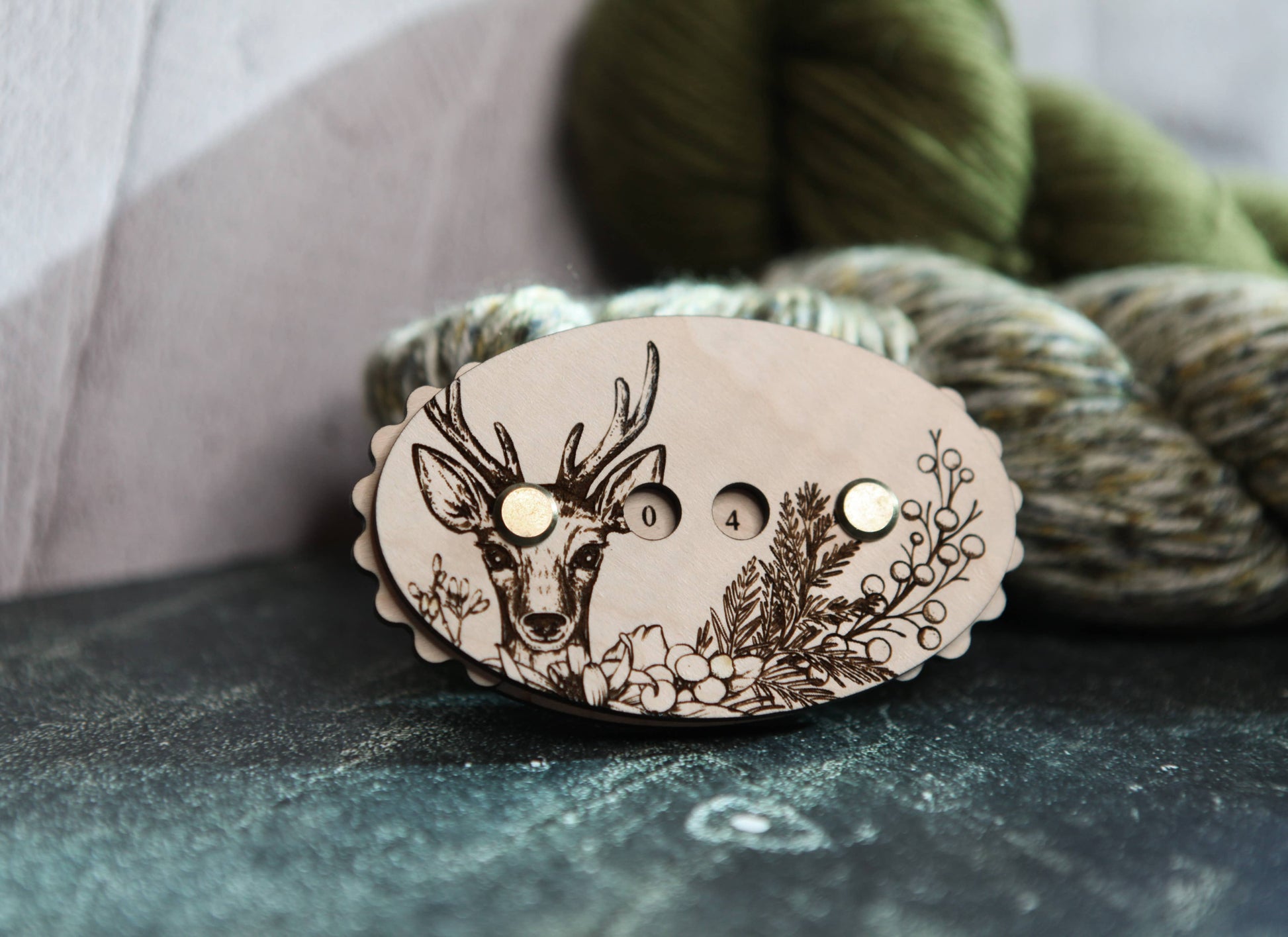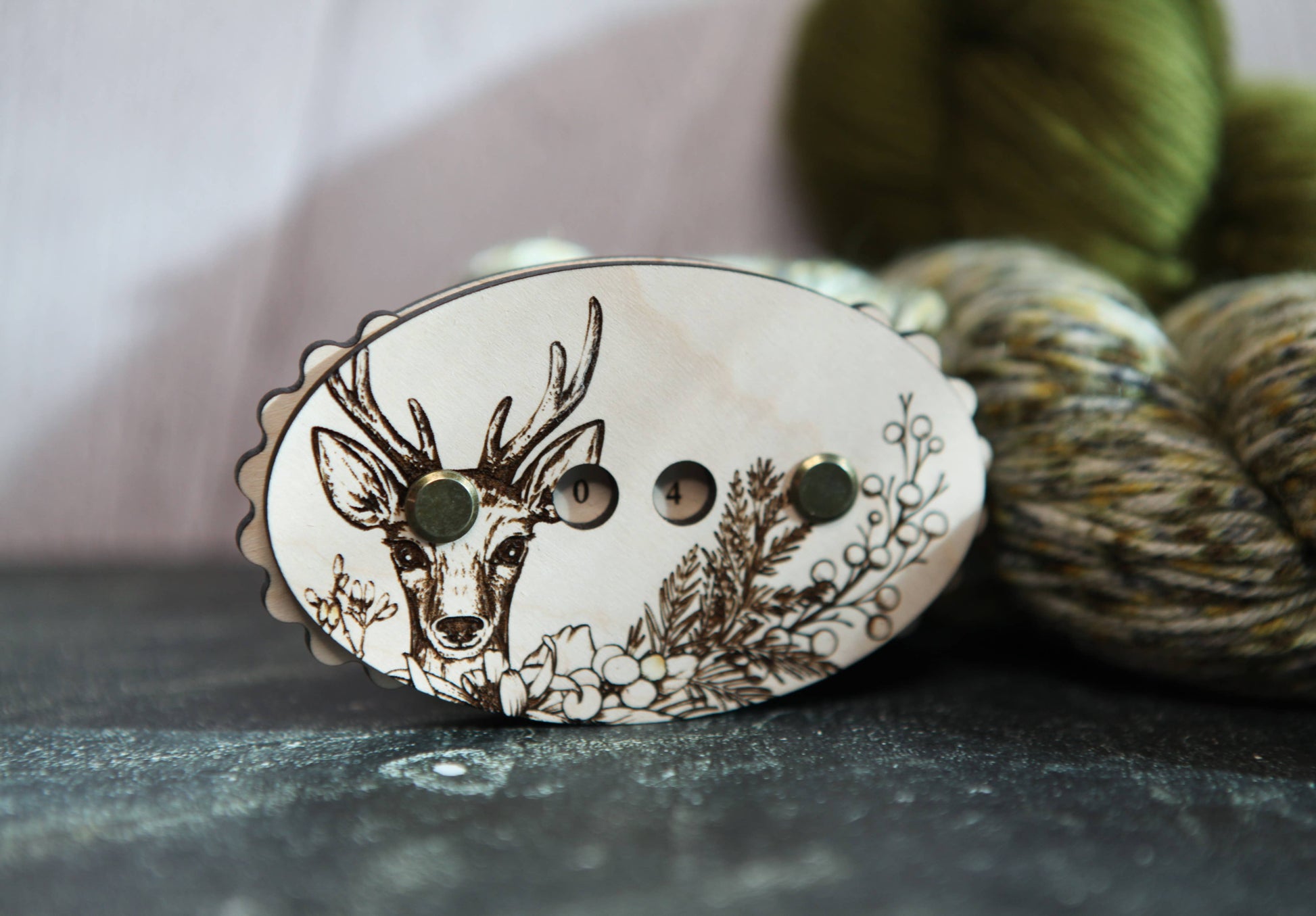A row counter is an important tool for any knitter or crocheter out there. This counter features a deer with antlers in the forest with plants and flowers. This oval knitting and crochet row counter is made is made from maple wood and contains two numbered wheels which are rotated to keep count of the finished rows. Numbers can go from 0-99.