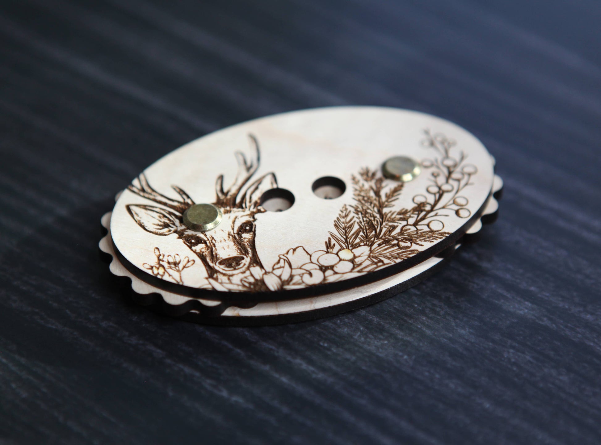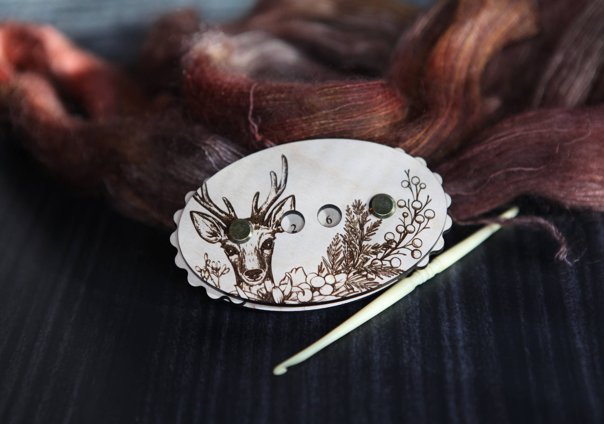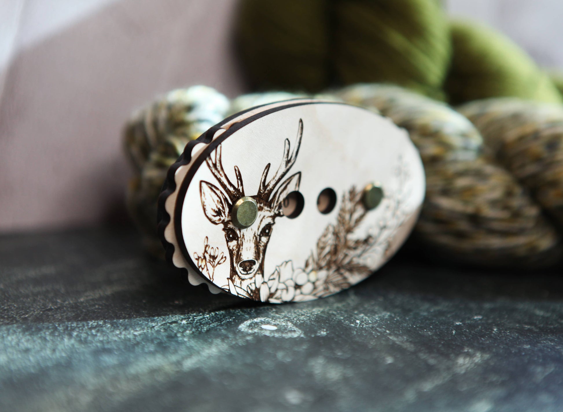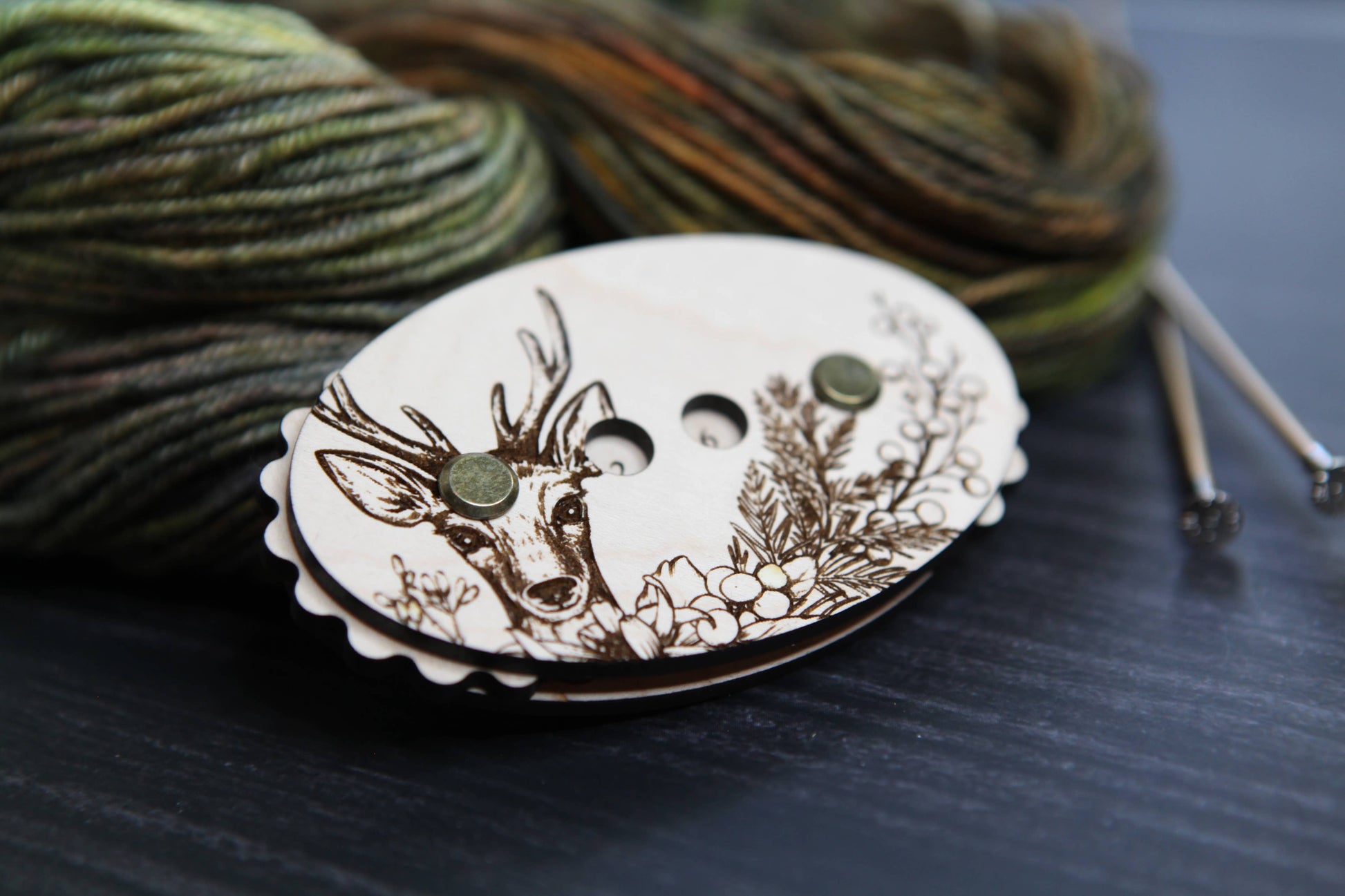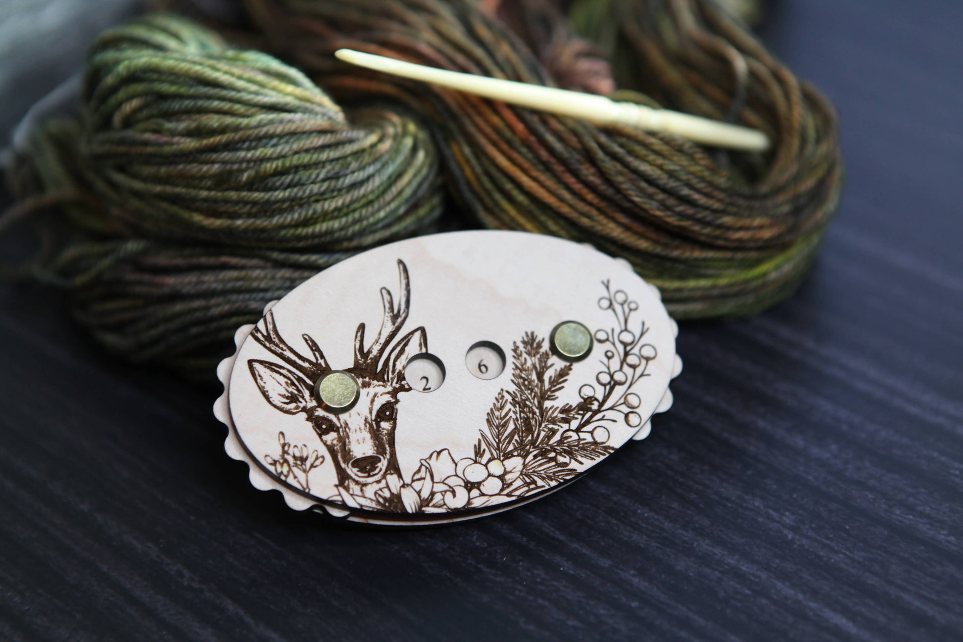 A row counter is an important tool for any knitter or crocheter out there. This counter features a deer with antlers in the forest with plants and flowers. This oval knitting and crochet row counter is made is made from maple wood and contains two numbered wheels which are rotated to keep count of the finished rows. Numbers can go from 0-99.