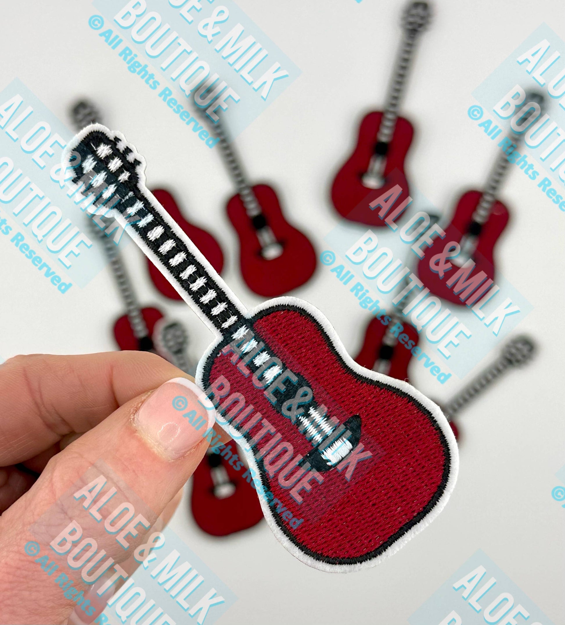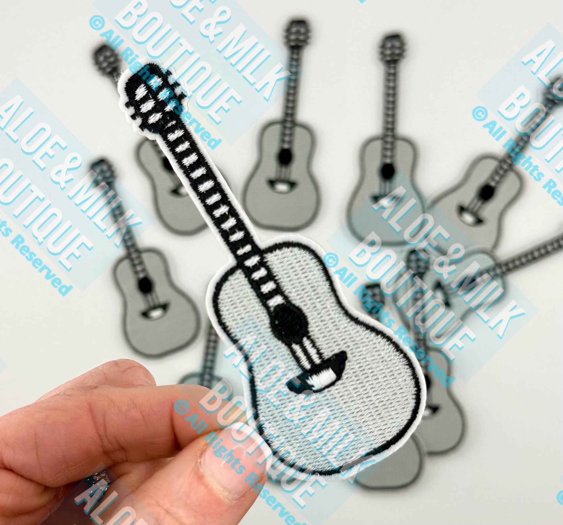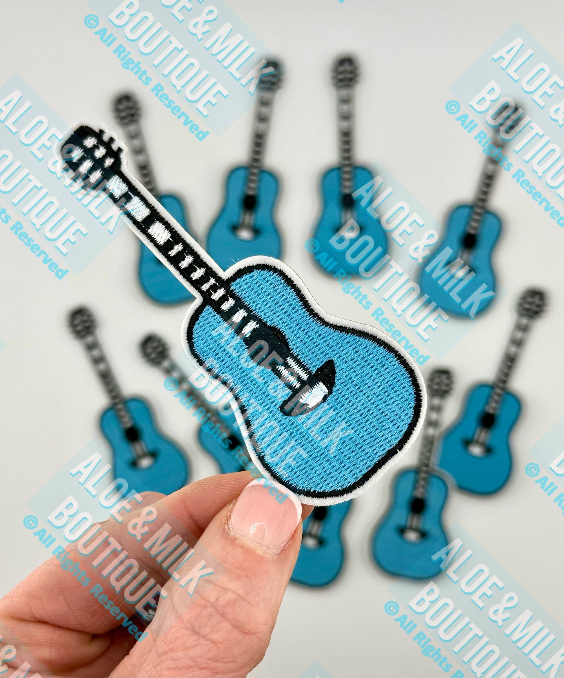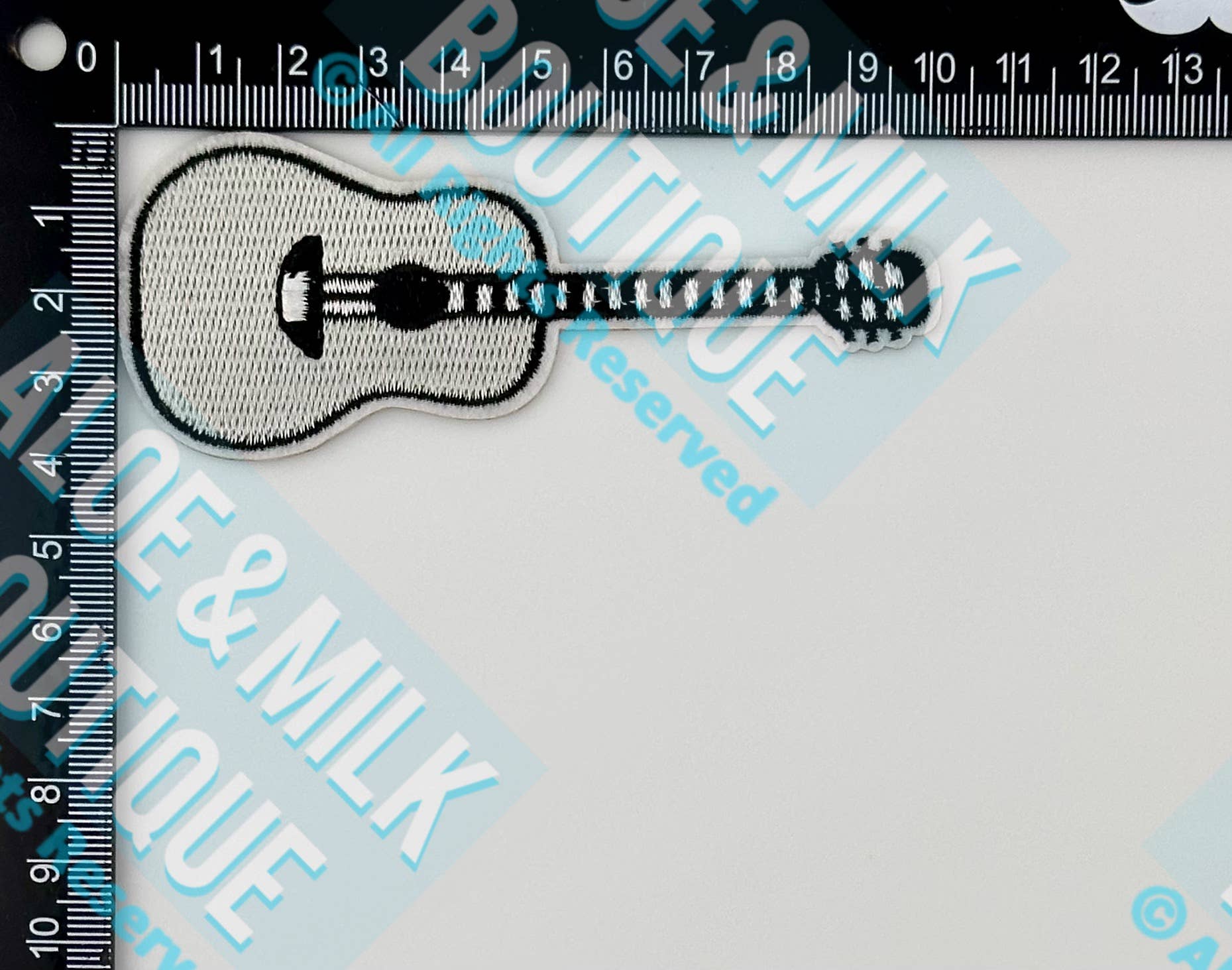 These guitar patches are 100% embroidered have laser cut border and iron on backing. Measures 3.9cm x 10.2cm. Great for hats, bags, clothing and more.