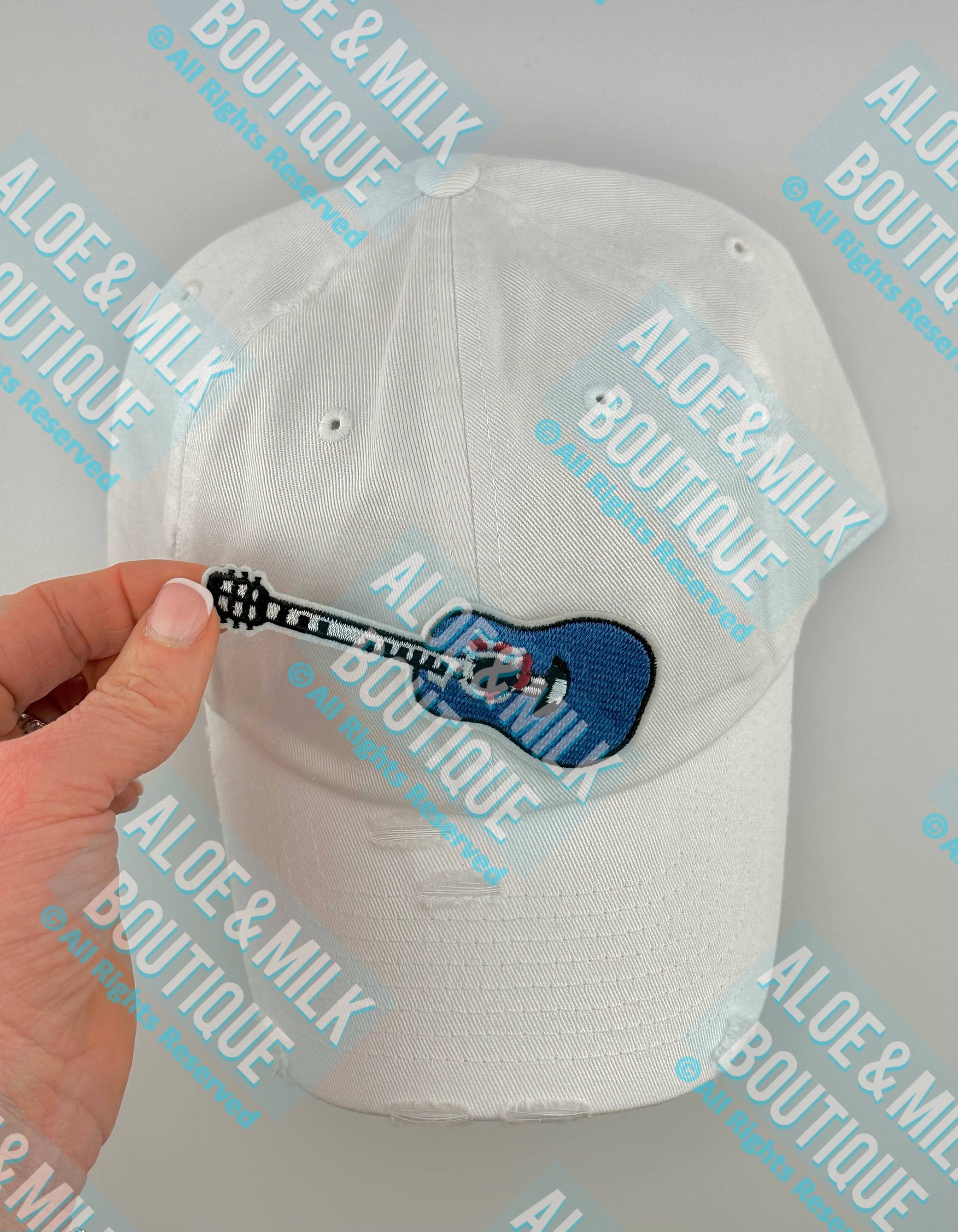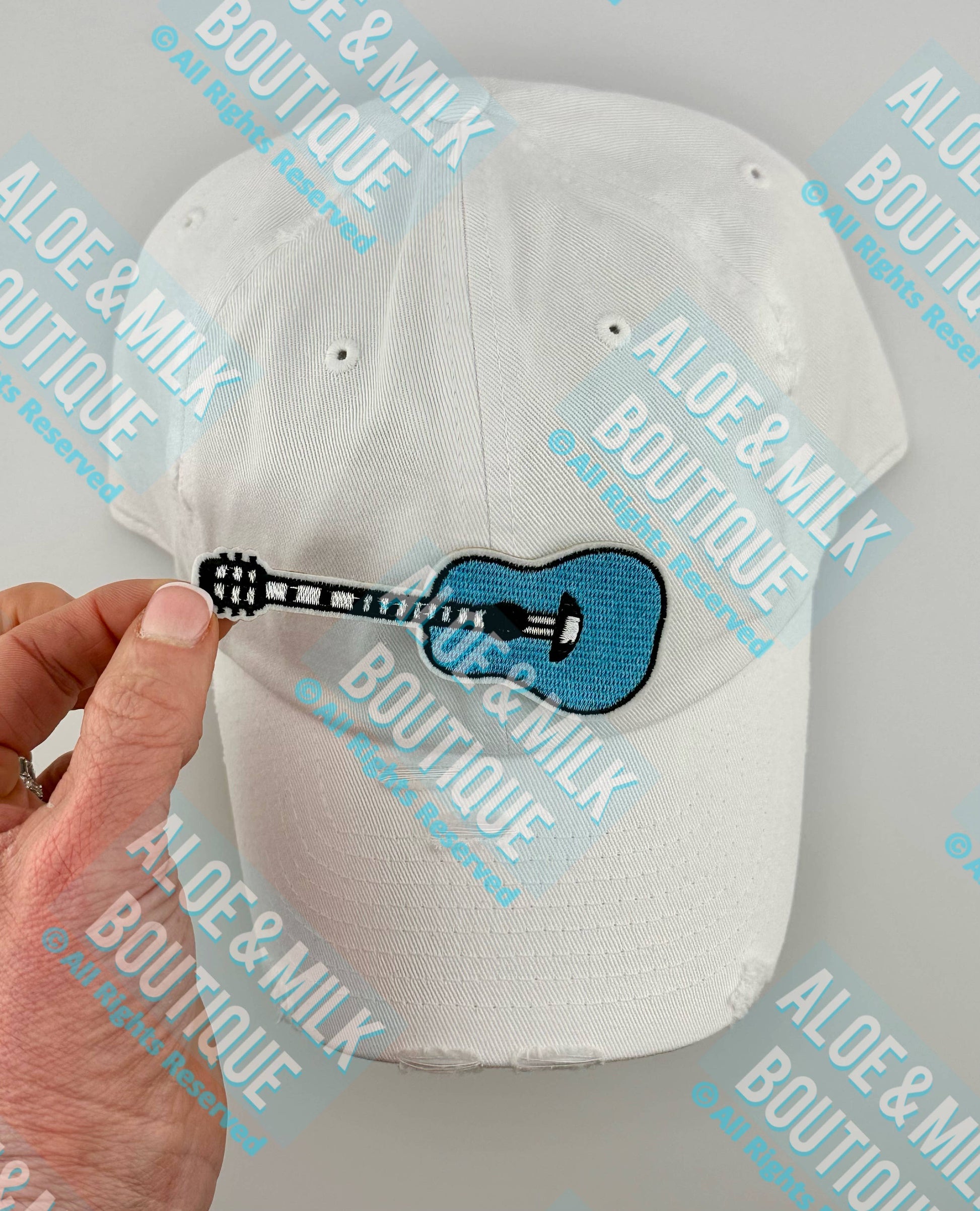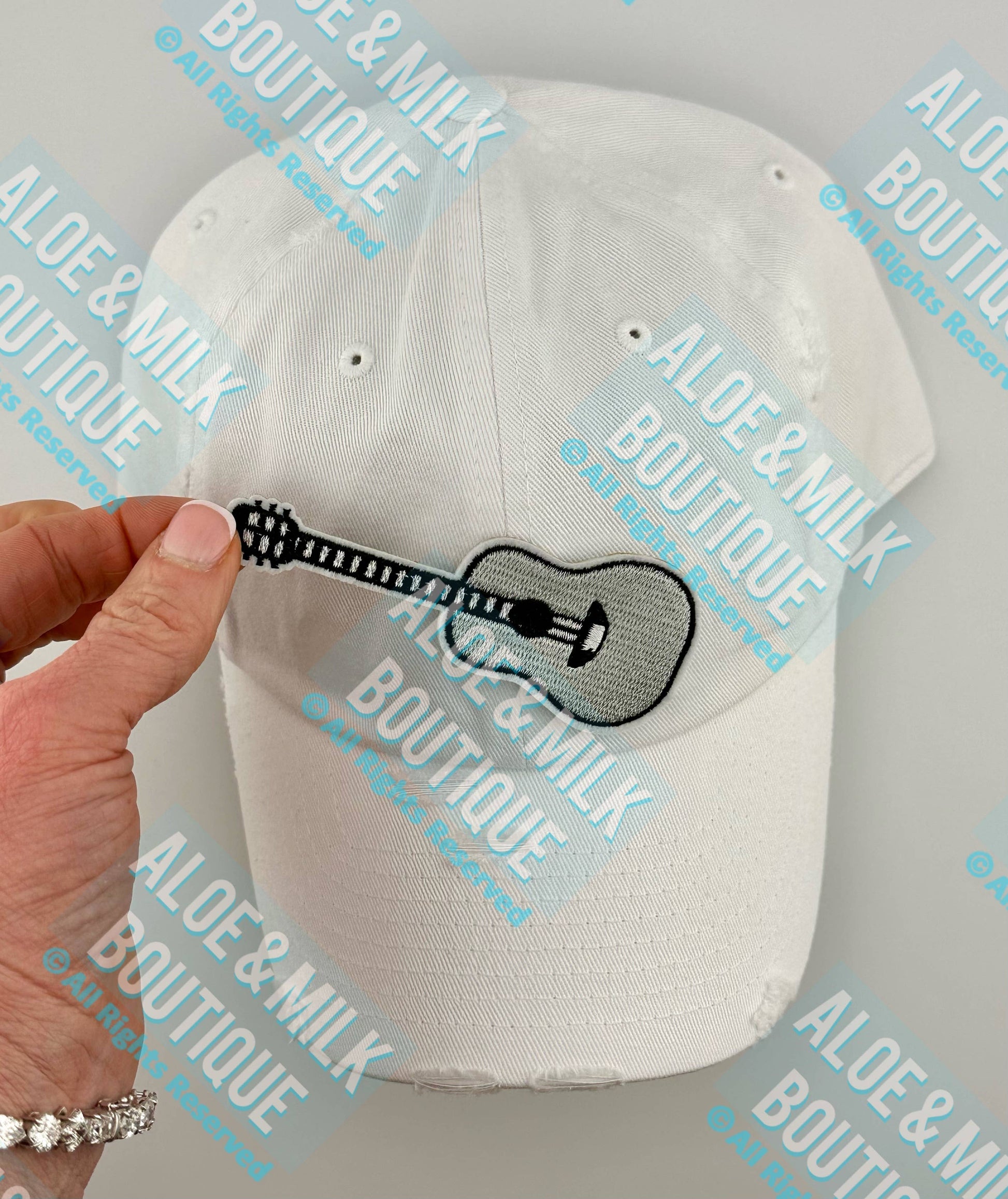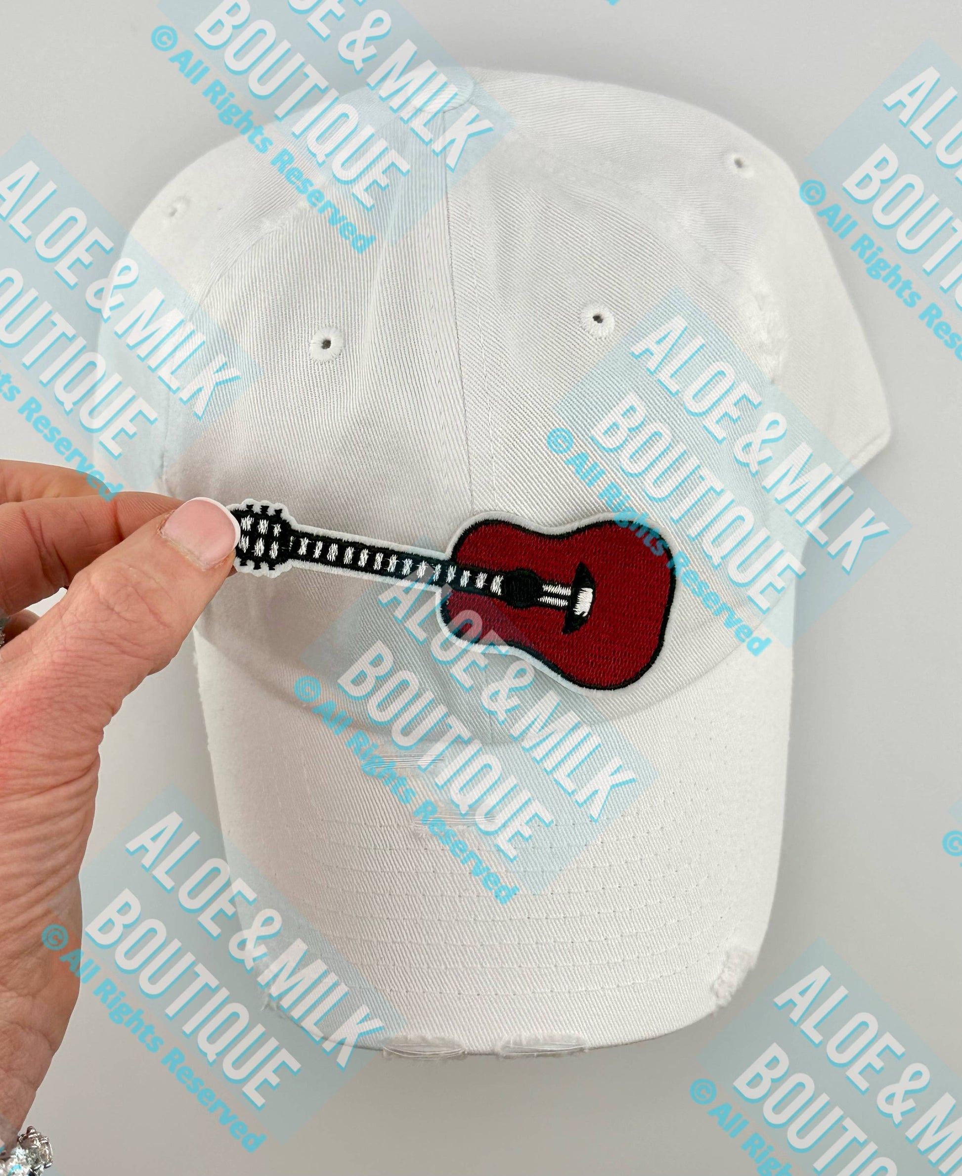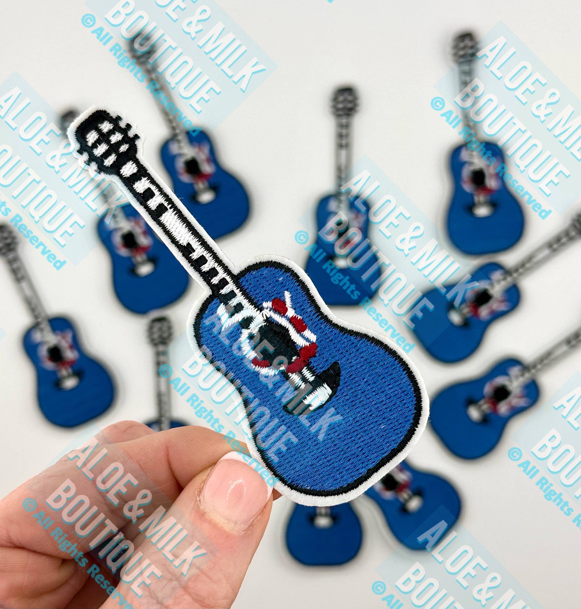 These guitar patches are 100% embroidered have laser cut border and iron on backing. Measures 3.9cm x 10.2cm. Great for hats, bags, clothing and more.