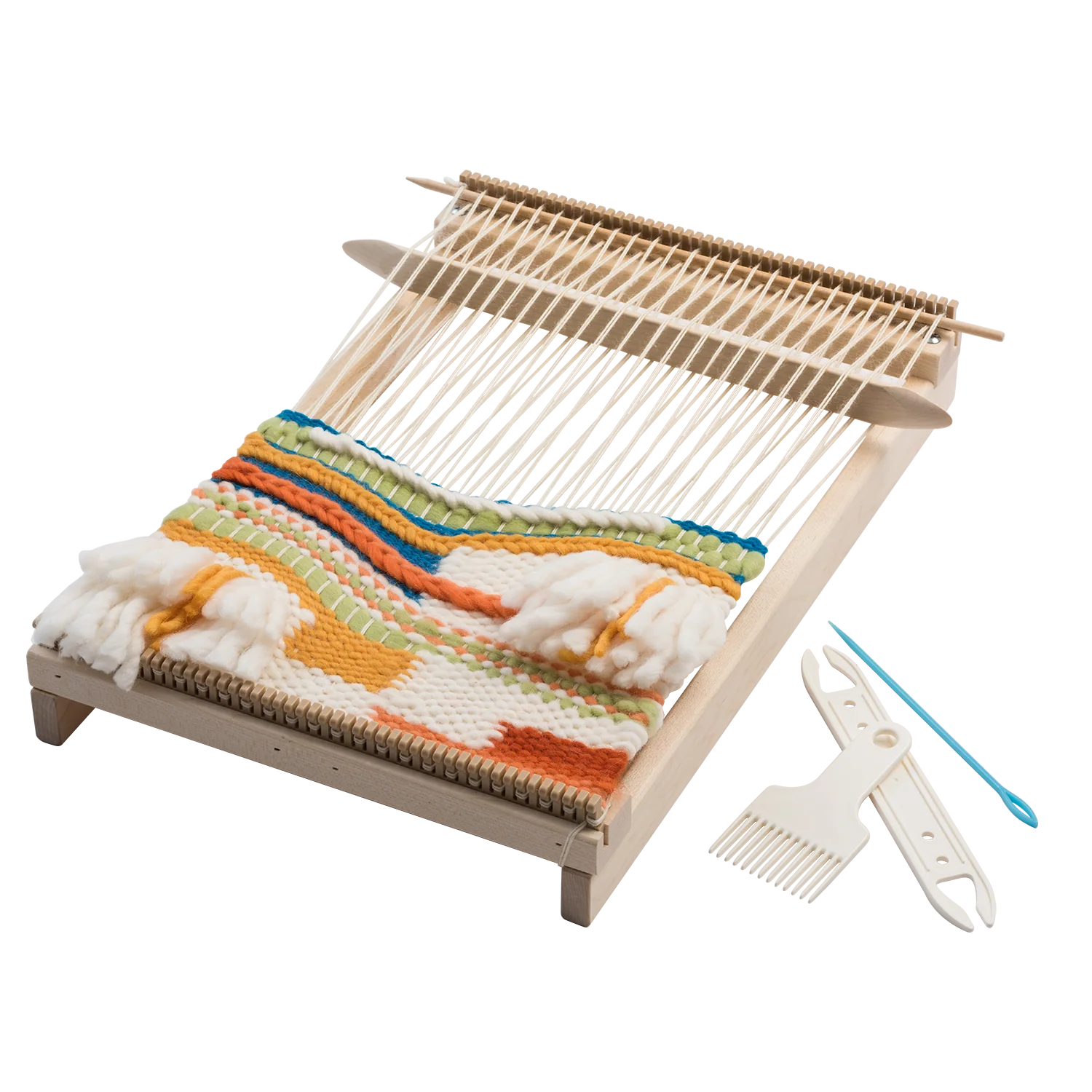 The Lilli Loom is made of solid hardwood maple with sturdy no-slip plastic teeth. You can wind the warp for either 6 or 12 ends per inch. The 10" x 15" is an ideal size for learning to weave, making samples, small projects, and travel.