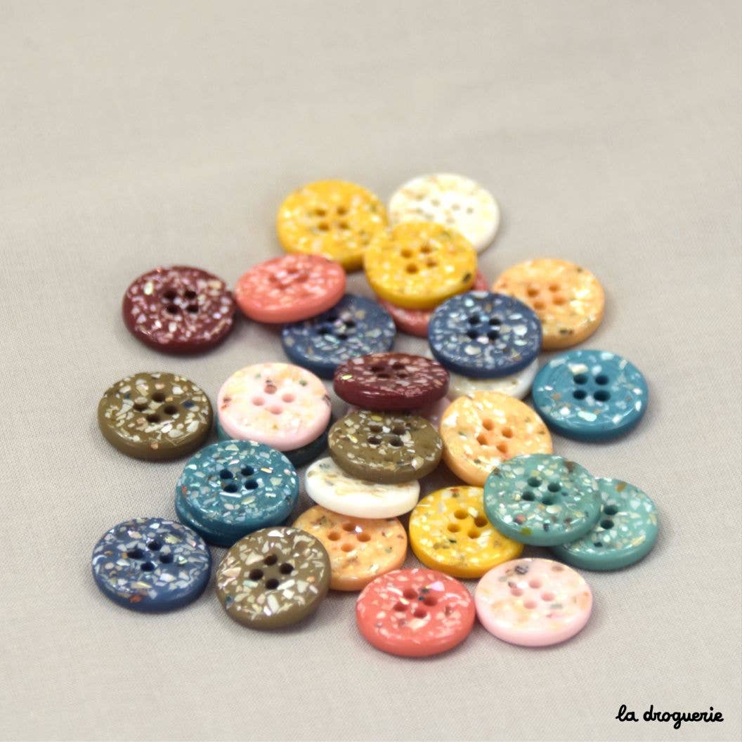 4-hole button, round, colored in polyester, it is smooth and flat. Inside, there are mother-of-pearl inlays that shine like small stones reflecting light. The inlays may slightly vary in color, making each button unique. It is a button with two holes for easy sewing onto all our clothes! Available in several colors.