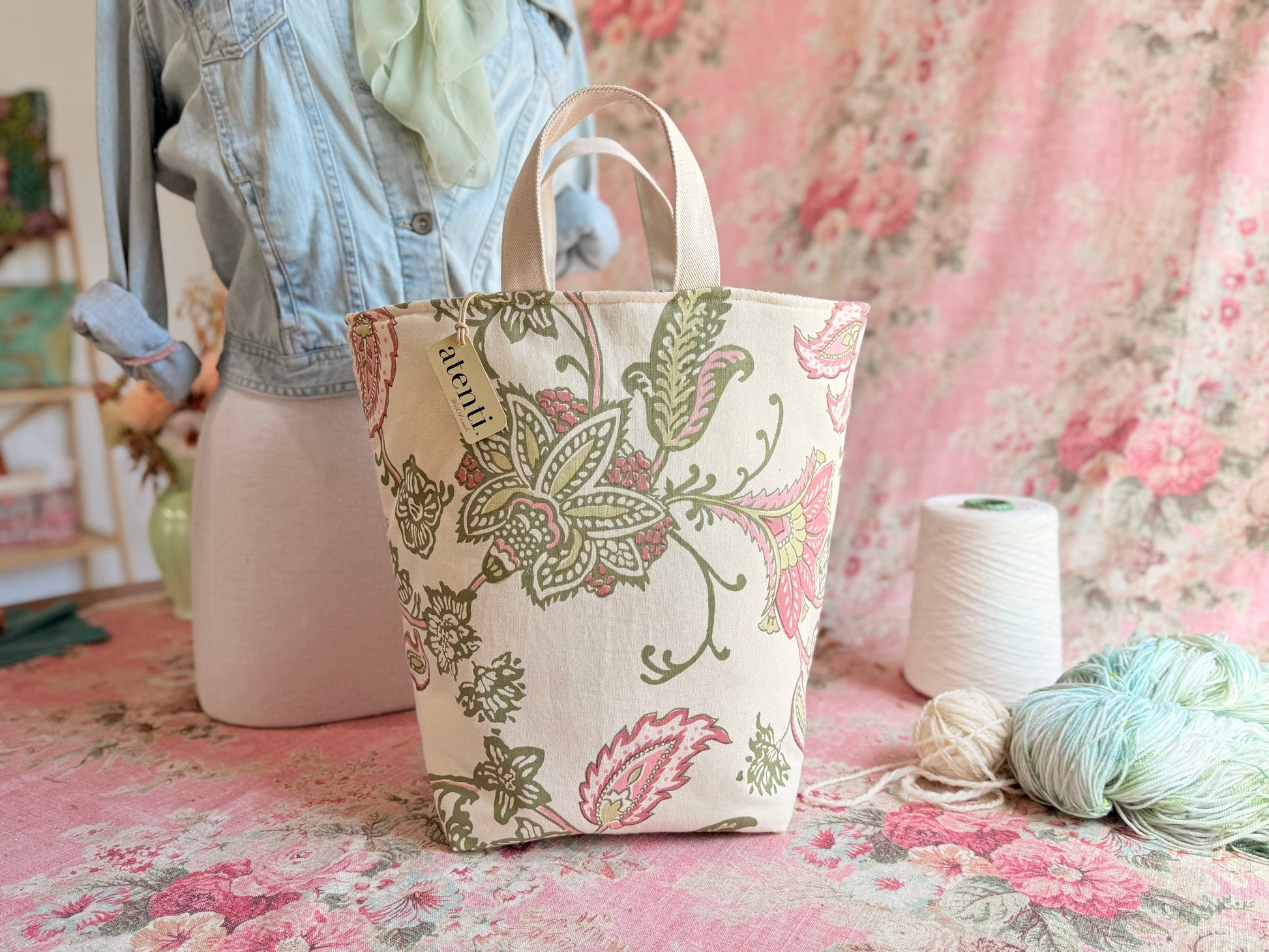 The Rosalie Hope Basket is a fresh floral favorite — soft, romantic, and built for makers on the move. Featuring vintage-inspired green and dusty pink florals on a creamy cotton canvas, this roomy tote is a beautiful catchall for yarn, projects, or home organization. Handmade in Los Angeles, this Hope Basket stands tall with structure, making it ideal for holding knitting and crochet WIPs, yarn skeins, or magazines. Sturdy cotton webbing handles allow for easy grab-and-go use, whether you’re heading to craft night or just organizing in style. Handcrafted in the USA | Perfect Gift for Crafters | Limited Seasonal Release Dimension: about 8x12x13 (at top)