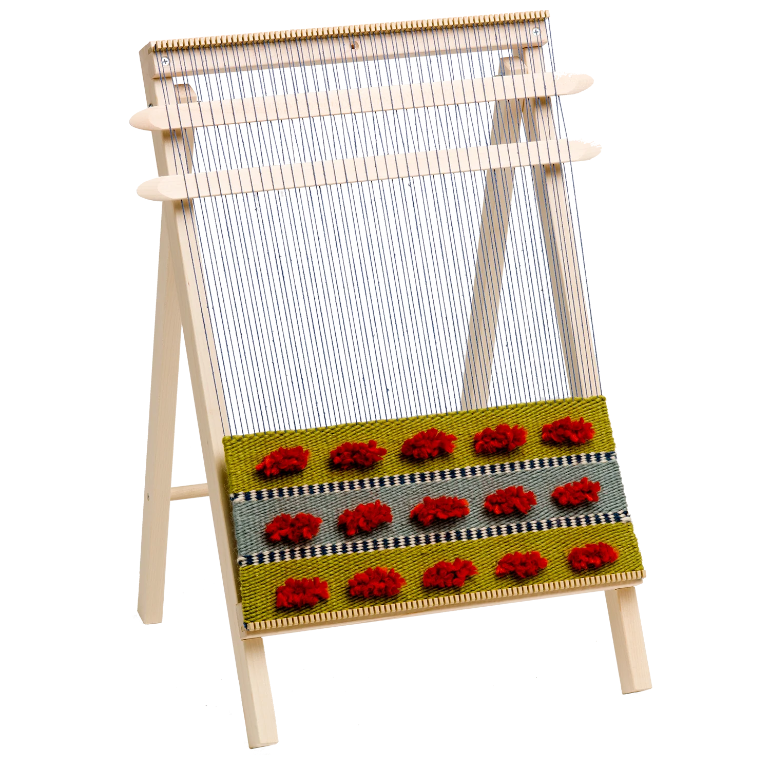 The School Loom comes with two pick-up sticks, a weaving needle, and simple warping and weaving instructions. It has a 15" x 20" weaving area, a built-in stand for upright use on the floor or a tabletop, and durable plastic teeth for a sett of 6 or 12 ends per inch. The School Loom is made of hard maple and left unfinished.