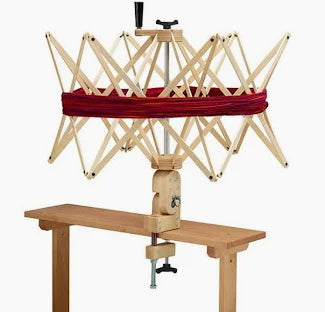 The Ultra Umbrella Swift is ingeniously designed to fit most tables. The Ultra turns freely on ball bearings and can be used vertically or horizontally. The wooden umbrella swift expands downward from the top to hold skeins up to 93" in circumference.